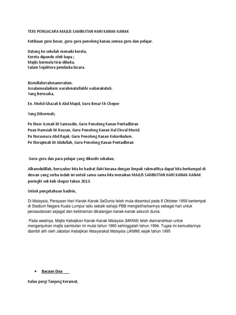 Teks pengacara majlis hari sukan sekolah tahun 2011. Teks pengacara majlis untuk ceramah program kesedaran & pencegahan malaria sempena sambutan hari malaria sedunia peringkat negeri pahang. Setiap kejayaan pasti bermula dengan langkah pertama. Teks pembawa acara pengajian, pernikahan, acara resmi, peringatan hut ri. Contoh teks pengacaraan majlis perhimpunan sekolah dalam bahasa inggeris untuk aktiviti panitia ataupun hip high immersive programme.