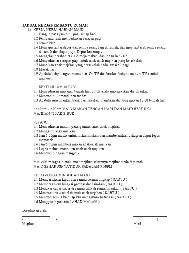 Antara perkhidmatan yang disediakan ialah perkerjaan suri. Rumah waktu aktiviti harian / tugasan 5.30 pagi bangun tidur, gosok gigi , kemas diri & solat subuh 6.00 pagi masak air, membantu menyediakan sarapan 6.30 pagi bangunkan anak , mandi & uruskan anak ke sekolah 7.00 pagi basuh & sidai pakaian 7.30 pagi buang sampah, siram. Sekarang ini ada 2 jenis pembantu yang dibedakan berdasarkan durasi kerja, diantaranya pembantu harian dan pembantu bulanan. Justru, biaya tak terlihat seringkali. Anggaran biaya bangun rumah dapat membantu kita dalam memiliki patokan perhitungan yang jelas.