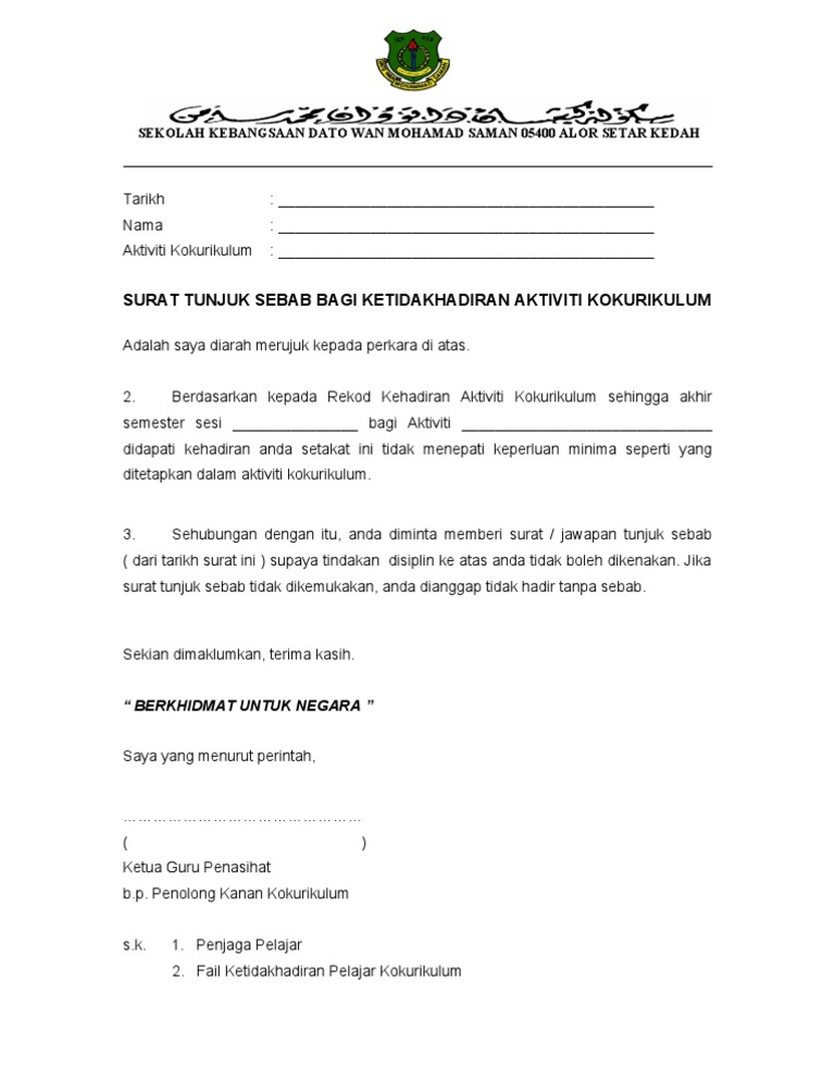 Contoh surat tunjuk sebab lewat via servismenulis.com. Surat surat rasmi ppim via www.slideshare.net. Saya ali bin ahmad, tidak dapat menghadirkan diri ke mesyuarat pada hari isnin 16 jun 2016. Sebelum itu, tersebar satu surat tunjuk sebab daripada lembaga disiplin umno terhadap hishammuddin yang didakwa melanggar perlembagaan parti itu dan tata etika sebagai ahli umno. Check 'surat perjanjian' translations into english.